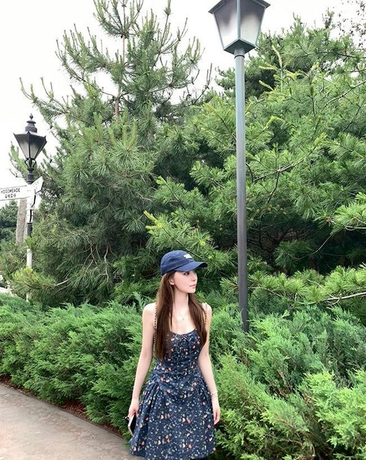 • Fri. 溫柔碎花裙 法式純棉小白花收腰連身裙 藍花