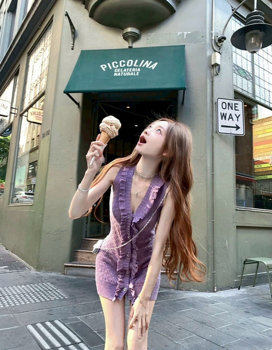• Mon. 女神一眼頂美V領緊身針織連身裙 紫