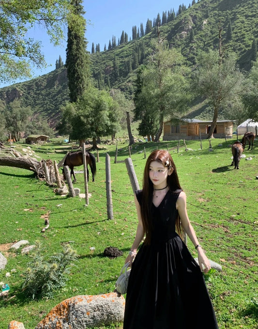 Mon. 出逃千金 翻領蝴蝶繫帶收腰連身裙 背心版 黑色