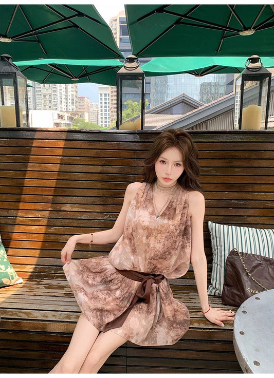 • Mon. 日暮盛夏復古V領繫帶收腰連身裙