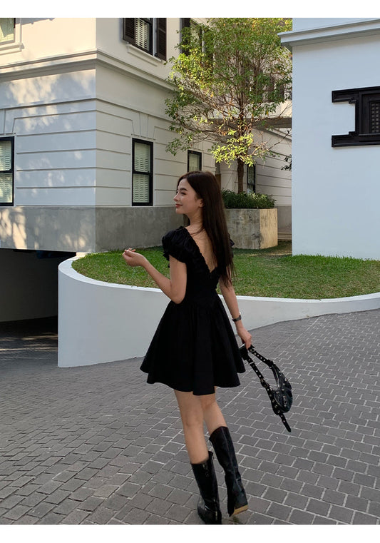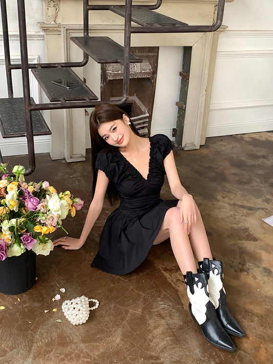 Sun. 法式收腰 v領泡泡袖連身裙 黑