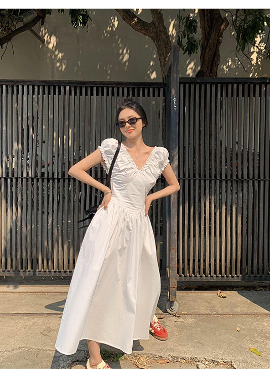 Sun. 法式收腰 v領泡泡袖連身裙 白