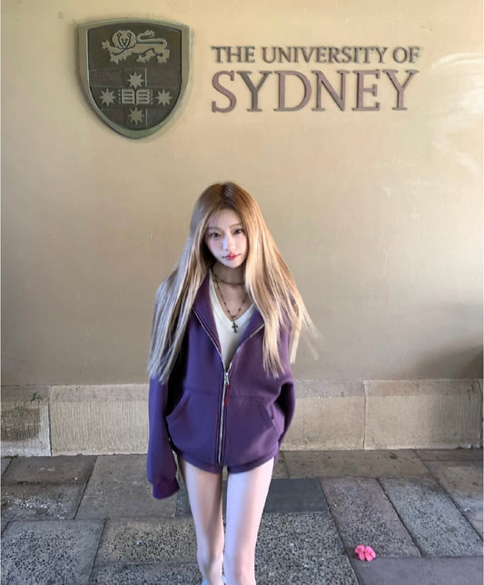 Wed. 運動系 寬鬆百搭顯白紫刺繡連帽外套短褲套裝 紫