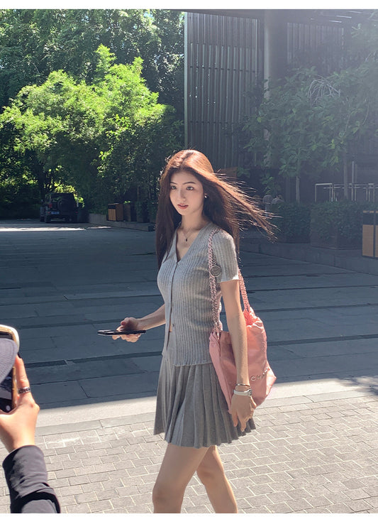 Sat. 基礎通勤 修身v領針織百褶裙短袖套裝 灰