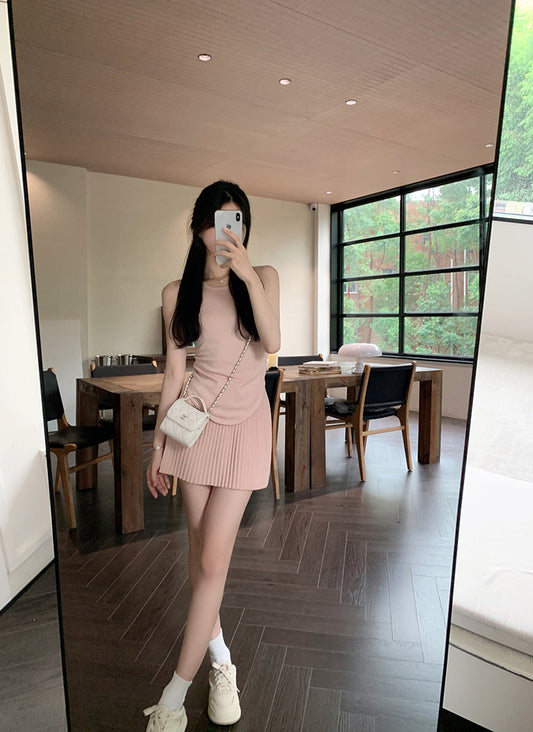 Sat. 氣質通勤套裝 圓領修身背心百摺裙套裝 粉