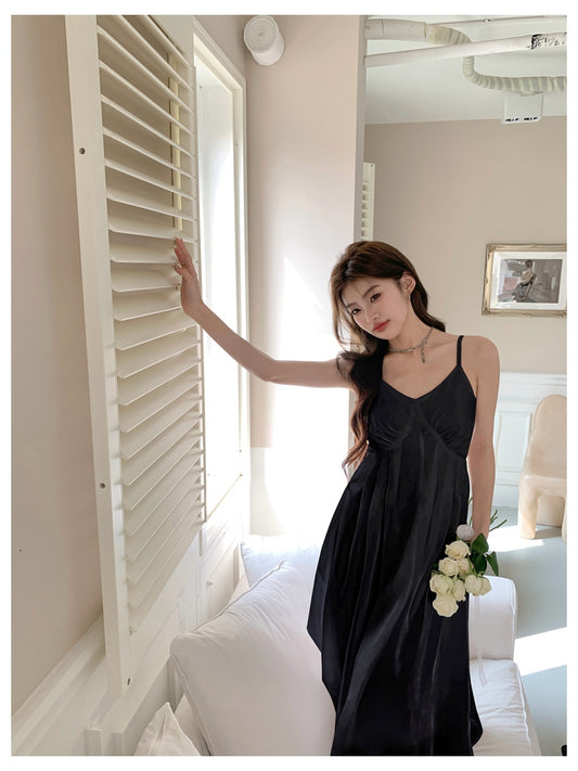 Sun. 氣質流光紗法式高腰V領連身裙 黑