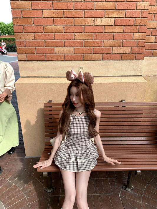 Sat. 牛奶拿鐵咖啡 復古格紋髮圈褲裝