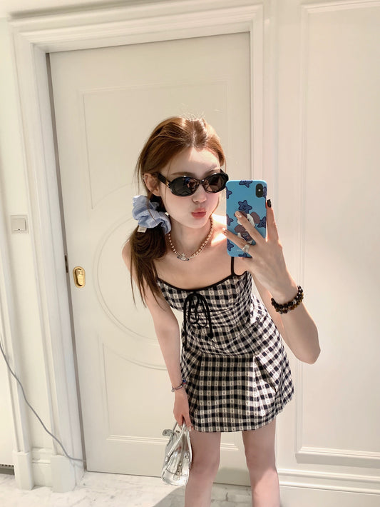 Sun. 紐約雨鎮 全棉綁帶收腰格紋連身裙 黑