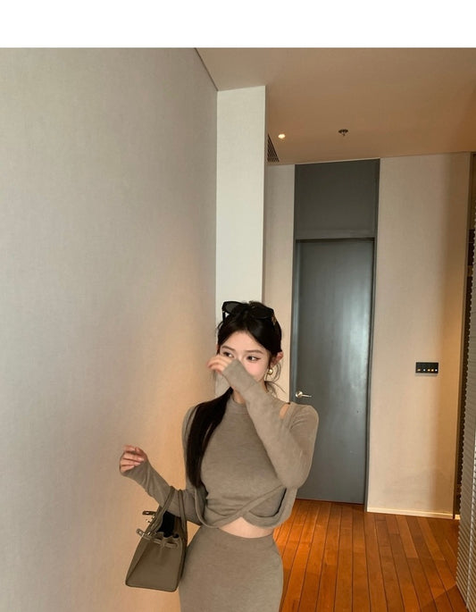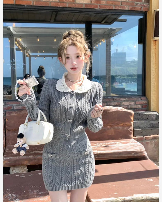 Sat. 神秘JeJu島 麻花粗鉤花領針織半身裙套裝 灰