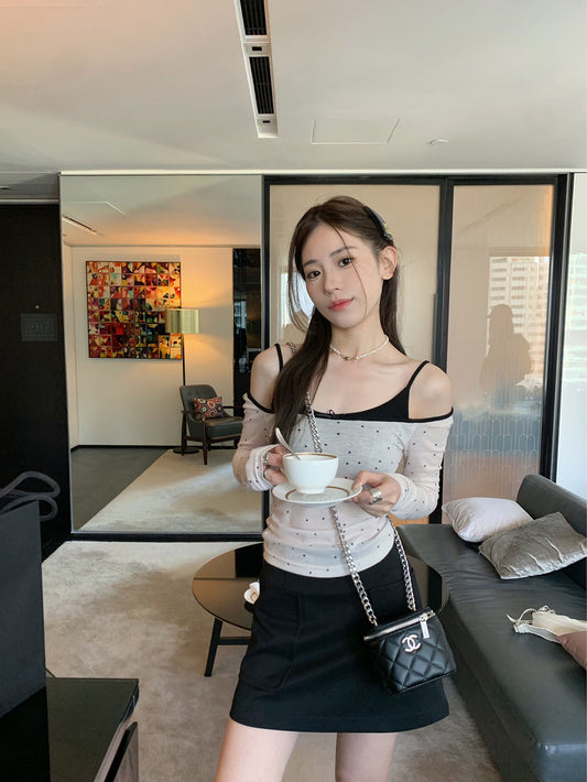 Wed. 氣質秀場款 一片剪裁露肩魚尾半身裙套裝 燕麥杏