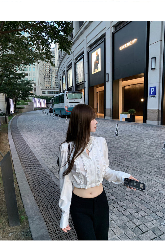 Sun. 千金歸來 手工釘珠木耳邊收腰短版襯衫上衣