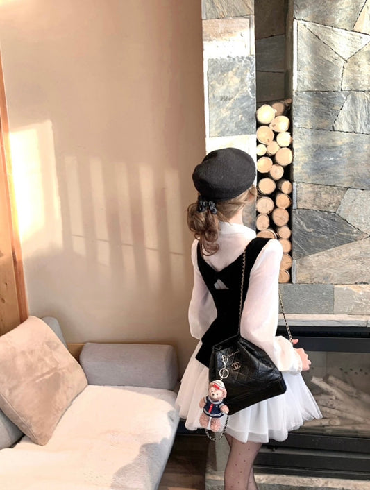 Thu. 強推Bi入 韓女氣質絲絨拼接網紗連身裙 爵士氣質蝴蝶結襯衫