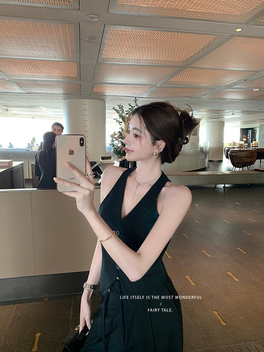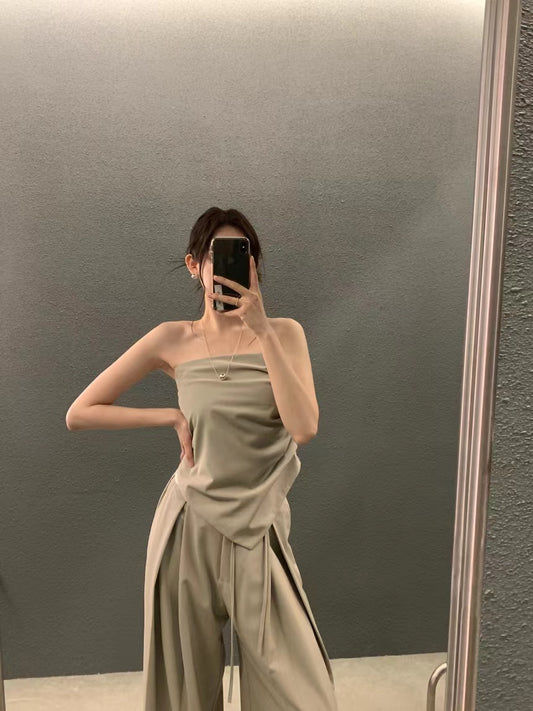 Sat. 氣質修身抹胸 高腰褶皺修身闊腿褲 黑/卡其