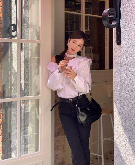 Wed. 氣質韓女 荷葉斜肩挖空設計長袖上衣 白