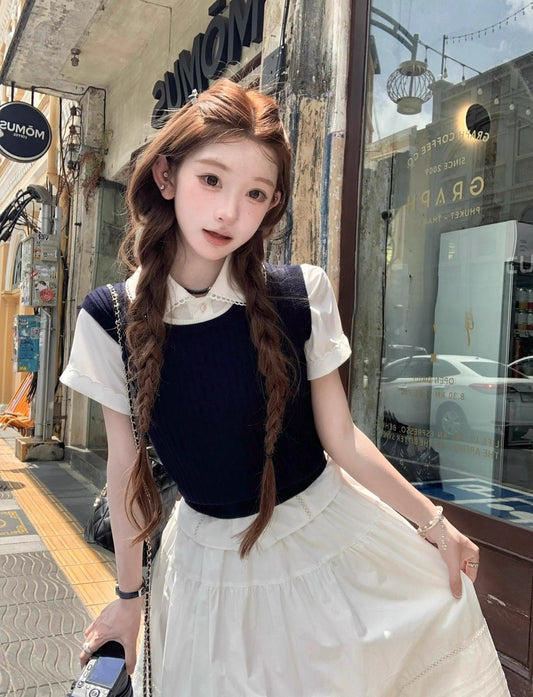 Mon. 氧系學妹mu家短款襯衫中長半身裙套裝/針織外搭背心