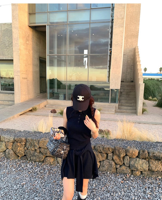 Sat.簡約單色馬甲背心+百褶裙套裝 深藍