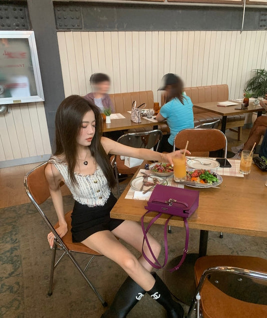 Thu. 撞色短版上衣+開叉背心 粉T棕色背心