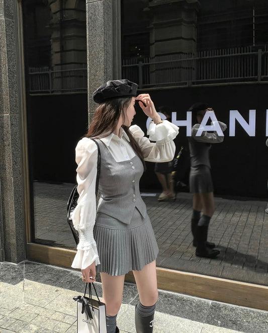 Sat.簡約單色馬甲背心+百褶裙套裝 白