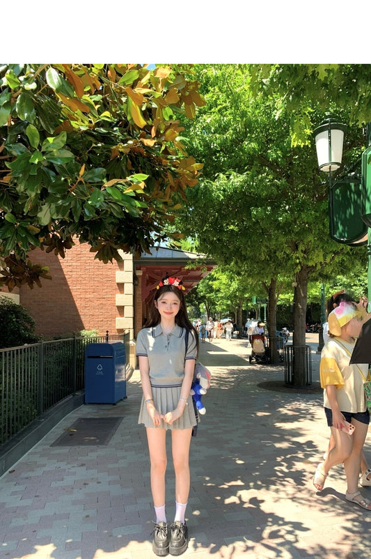 • Sat. 出片穿搭 學院風polo領針織百褶裙套裝 灰