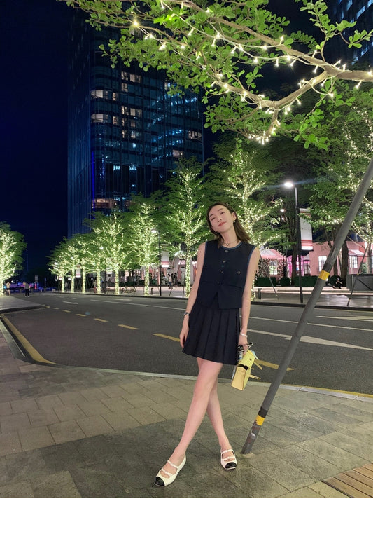 Sat.簡約單色馬甲背心+百褶裙套裝 深藍