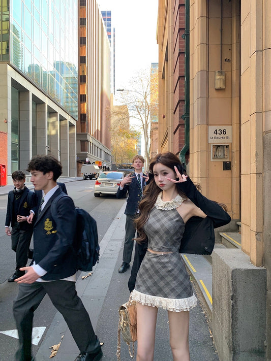 • Sat. 澳洲留學生 格紋蕾絲拼接削肩裙裝