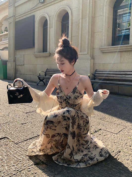 Fri. 溫柔碎花裙 法式純棉小白花收腰連身裙 藍花