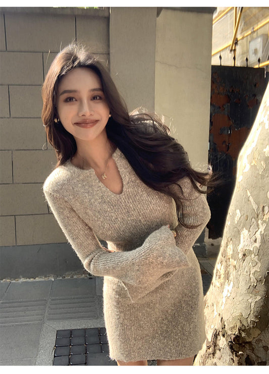 Sun. 修身收腰小V領針織連身裙 杏