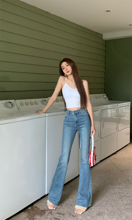 Mon. 復古顯瘦高腰喇叭褲 淺藍