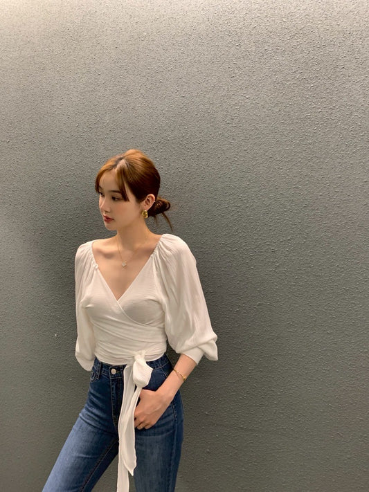 Thu. V領顯瘦短款綁帶雪紡衫 白/黑