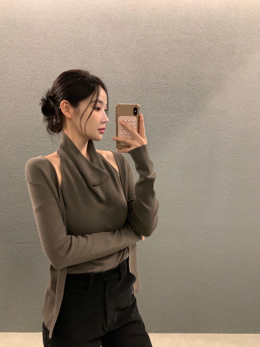 Fri. 氣質女人 設計款背心拼接假兩件式長袖上衣 咖/黑