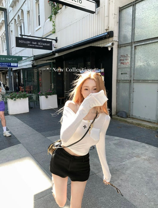 Wed. 精緻cail girl設計感v領修身長袖上衣 白/黑