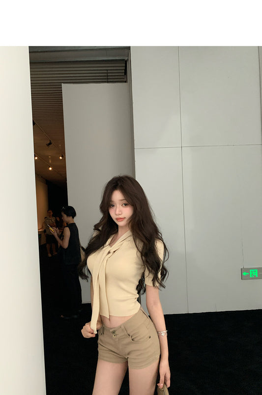Wed. 韓chic女主播 飄帶修身五分袖針織上衣 杏