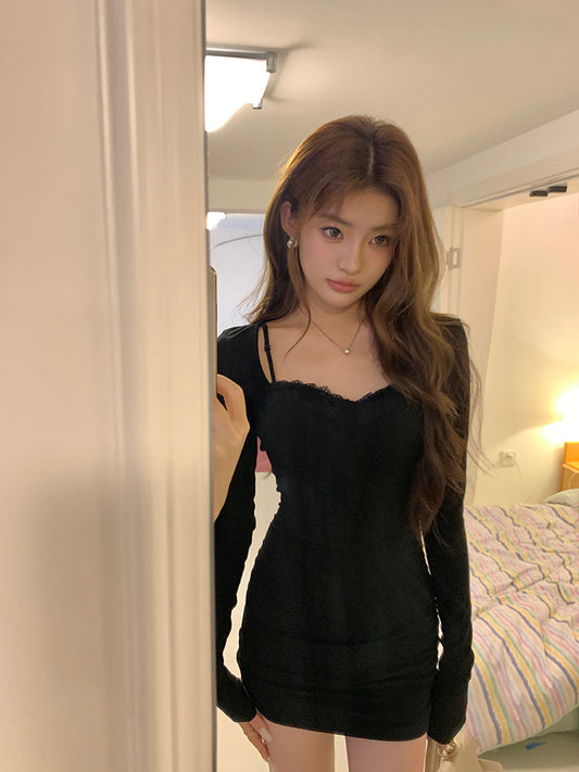 Wed. 蕾絲馬甲拼接打底連身裙 黑
