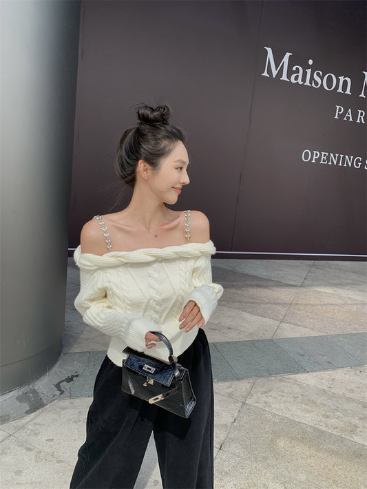 Tue. 氣質一字鏈肩麻花針織上衣 杏