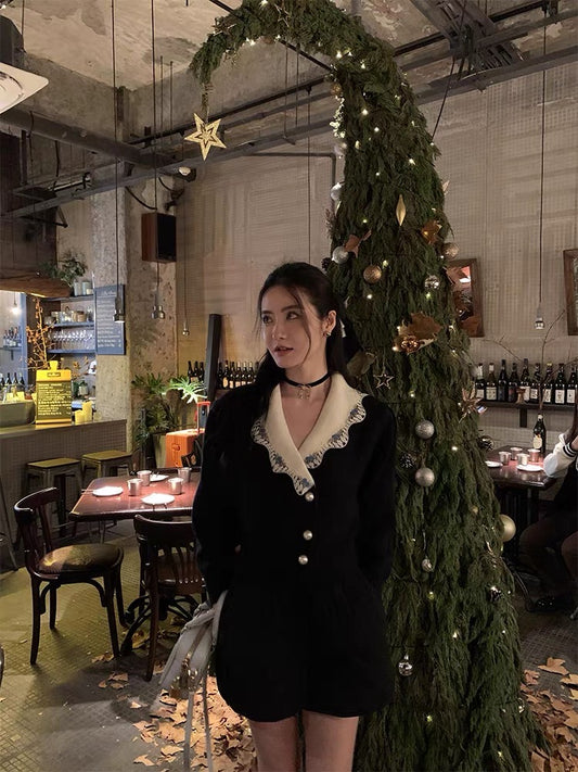 Wed. 扣環翻領2穿針織上衣 黑/咖