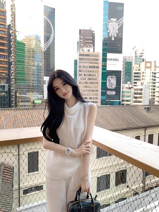 Sat. 懶人鬆弛感 圓弧下擺背心 休閒闊腿褲套裝 藏藍/灰