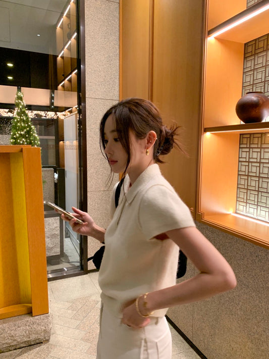 Tue. 個性單排扣polo領小短袖針織上衣 灰/米