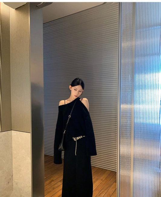 Wed. 辣妹冬日 慵懶不規則露肩針織上衣 黑