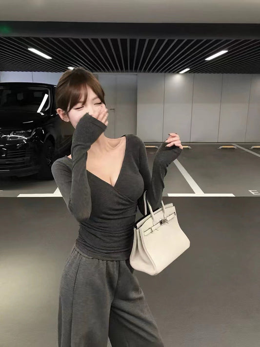 Sun. 心機美人 v領抓皺收腰打底長袖上衣 黑/灰/白