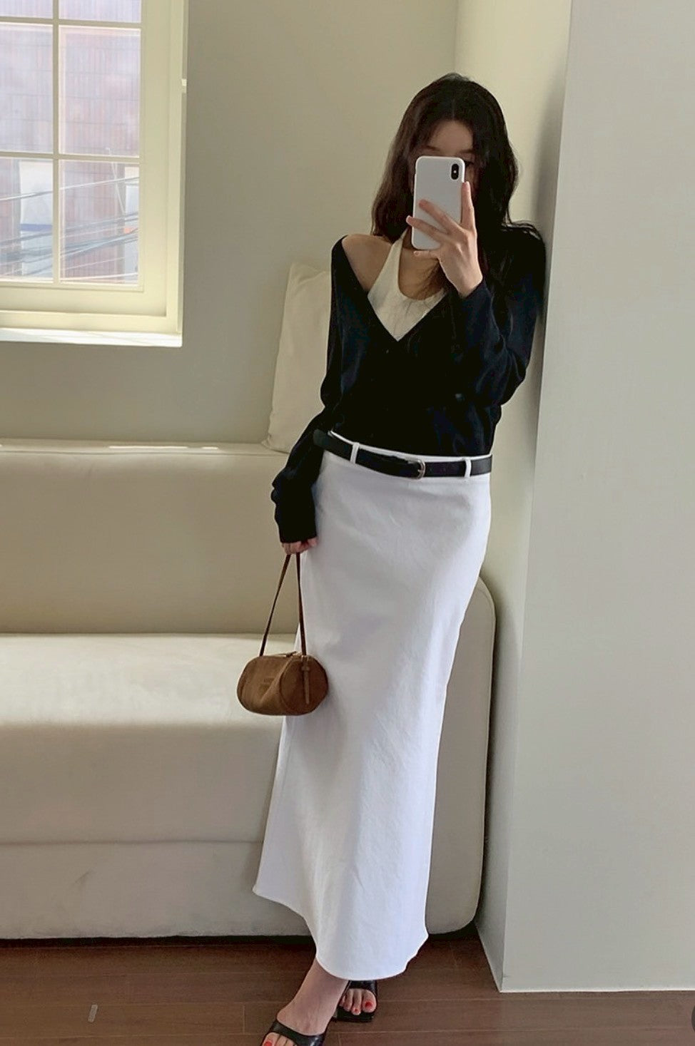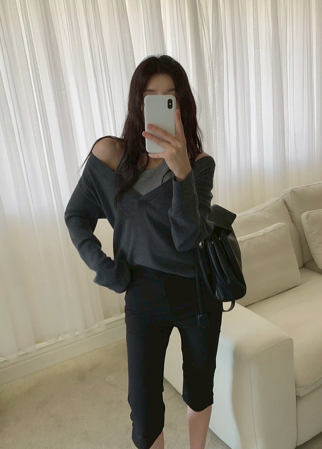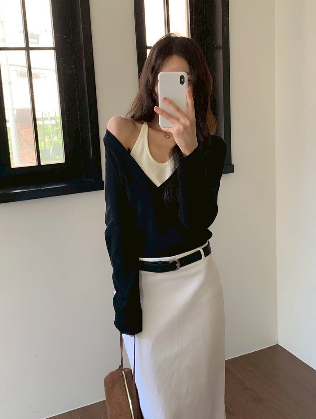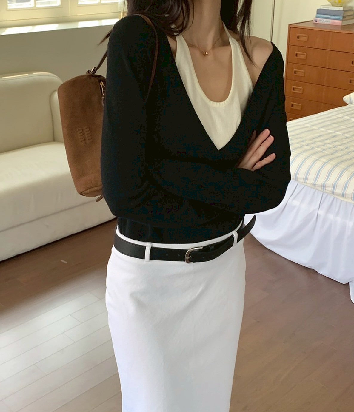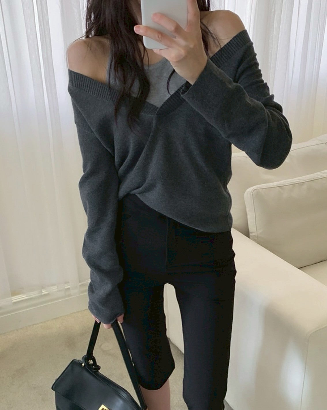 Fri. 氣質假兩件式撞色針織上衣 黑拼白/灰拼色