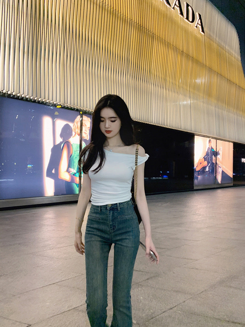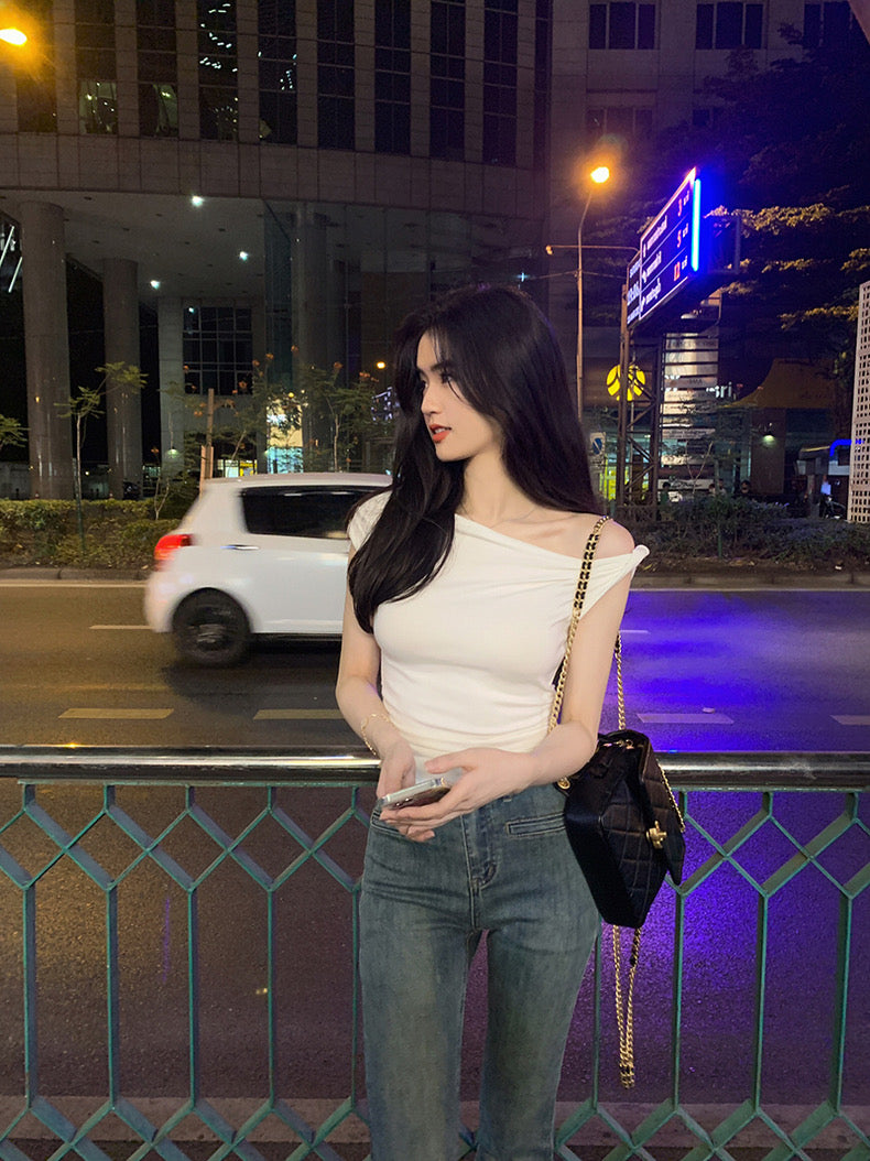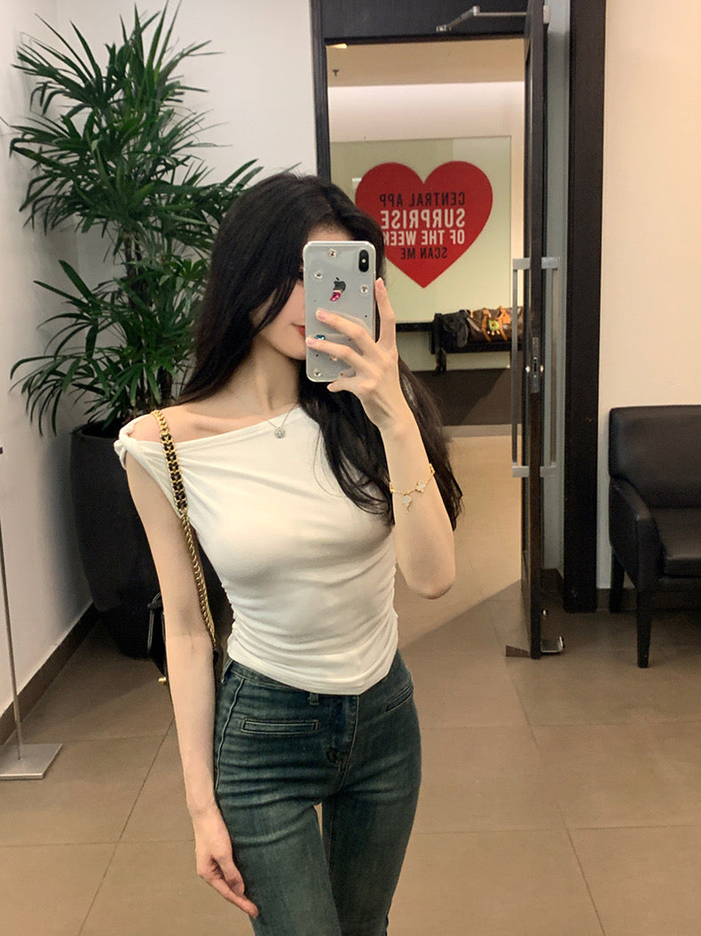 Fri. 氣質斜肩紐結設計上衣 白/深灰