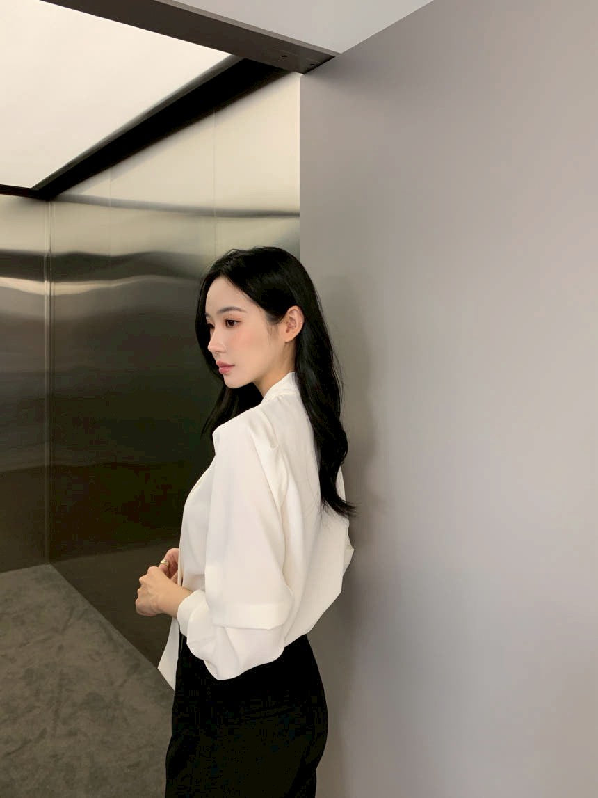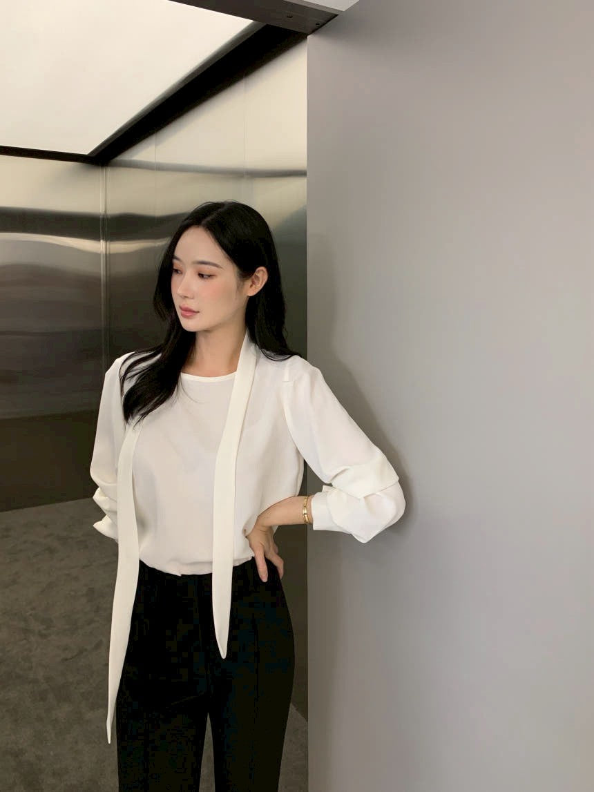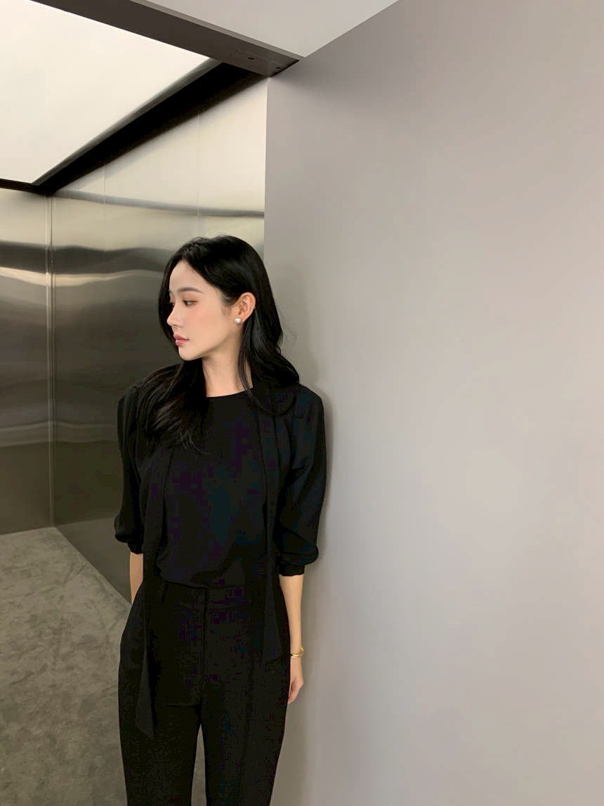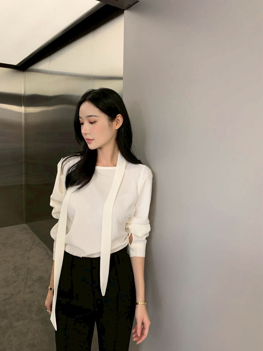Fri. 法式新款掛脖飄帶氣質上衣 黑/白