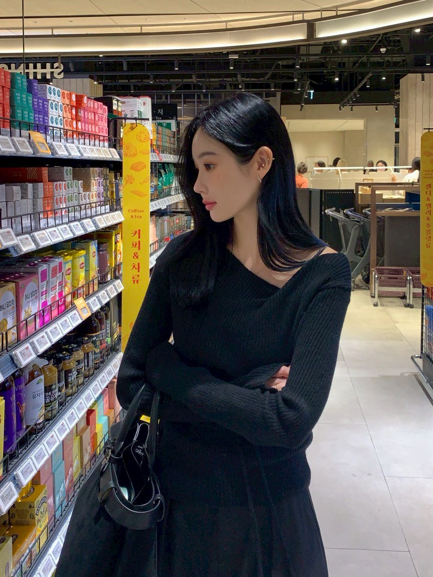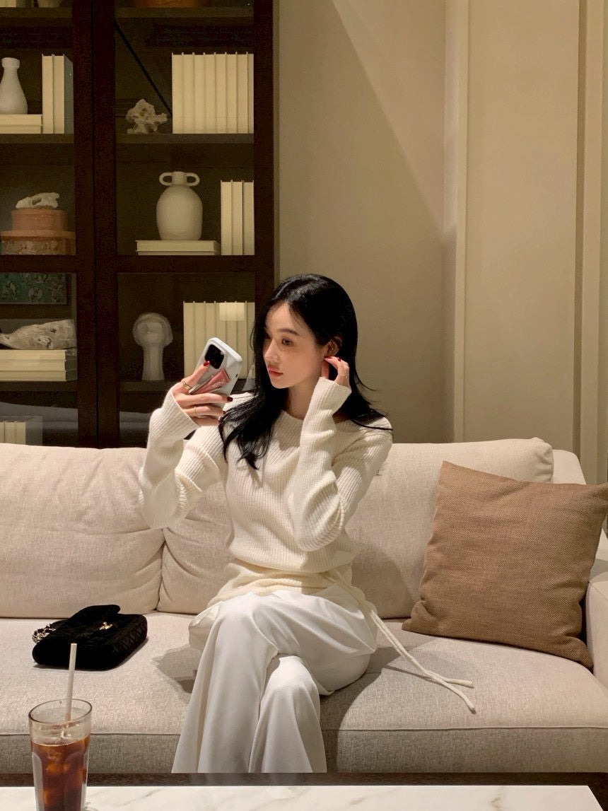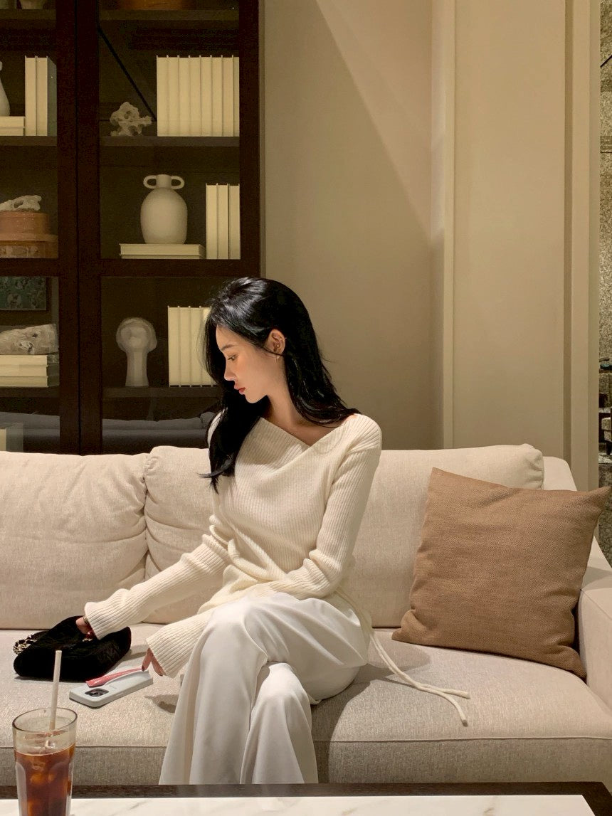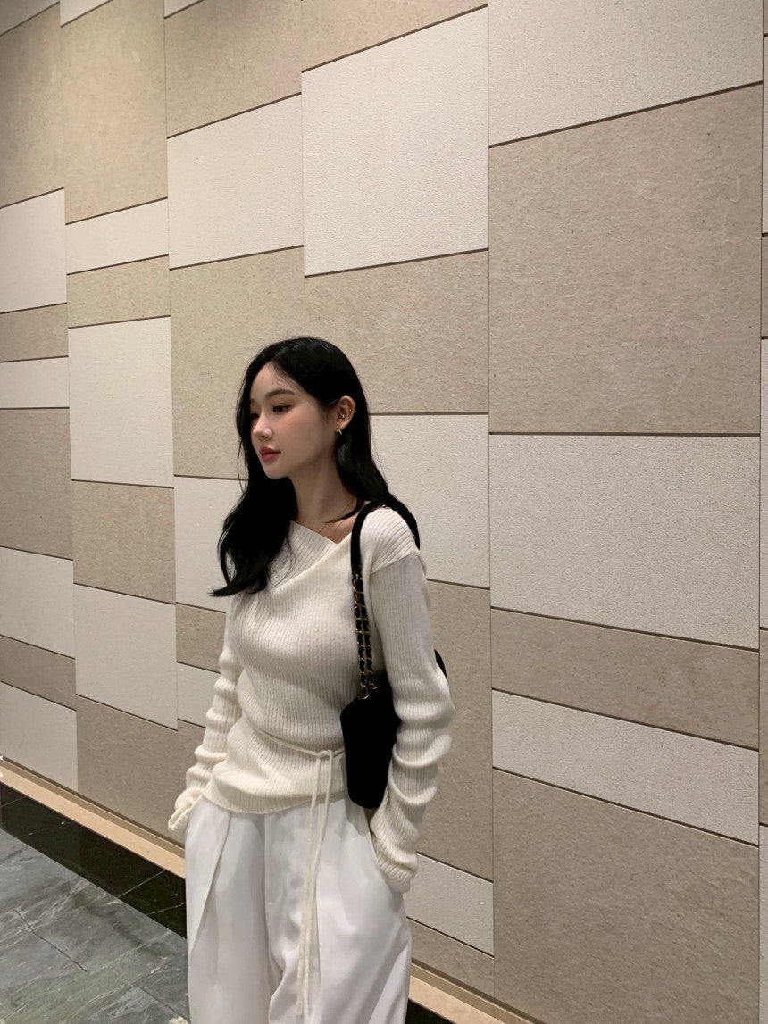 Fri. 秋冬設計感修身繫帶慵懶針織上衣 黑/米白