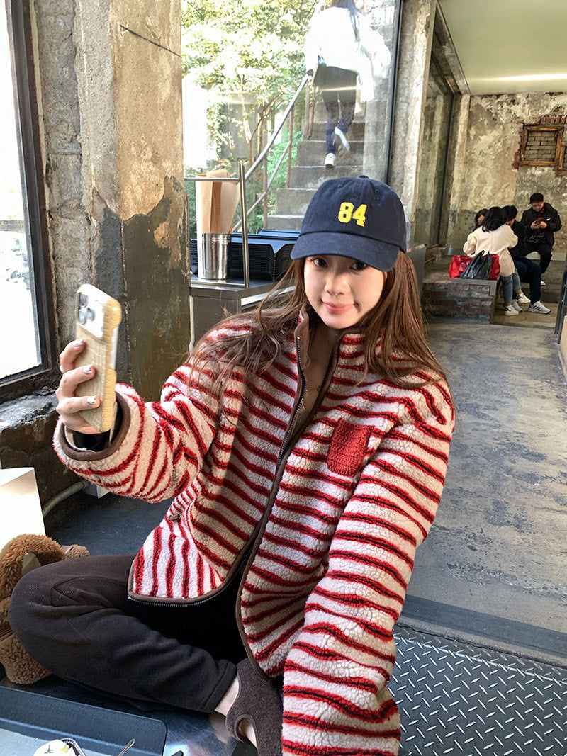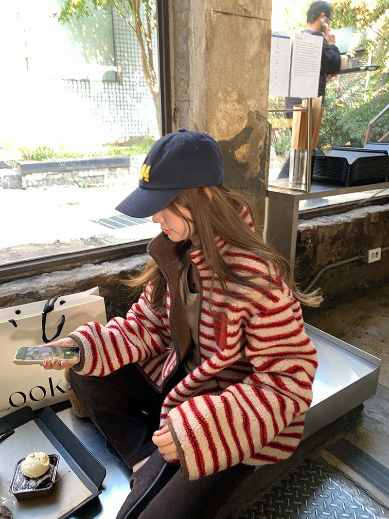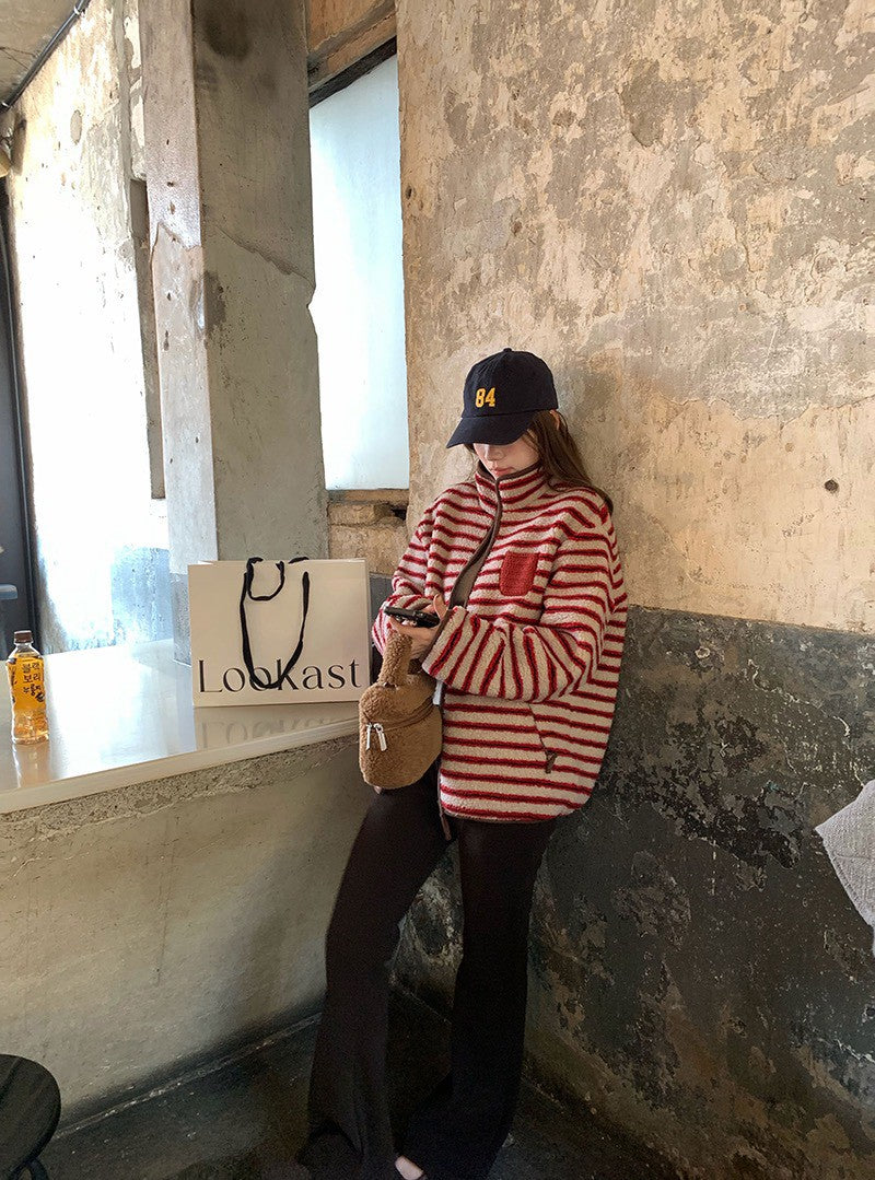Fri. 莓莓榛果派‘’厚實立領小口袋羔毛針織外套 拐杖紅條糖