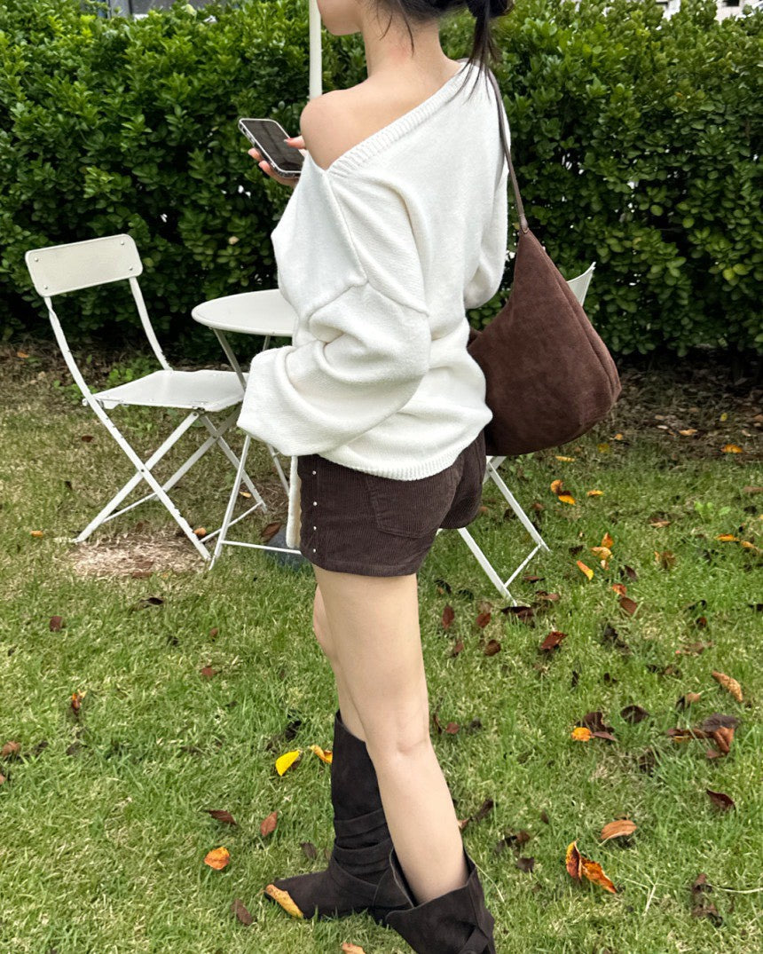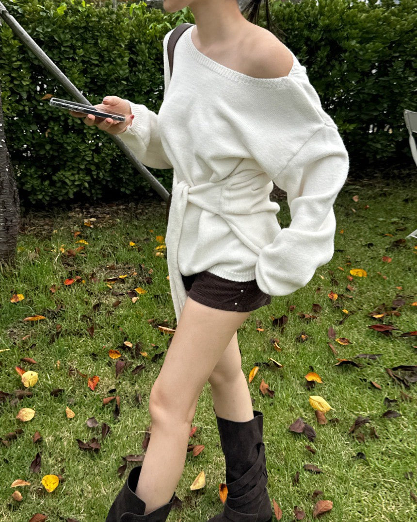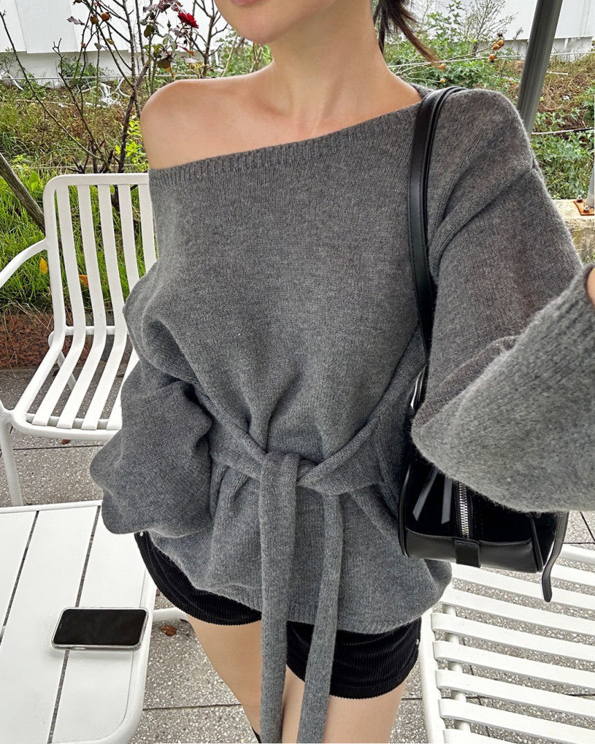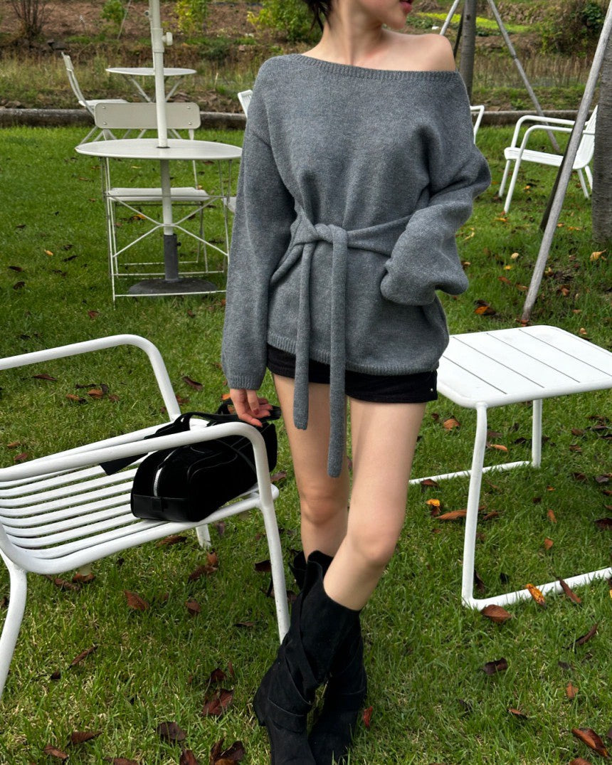 Fri. 韓chic簡約風一字領繫帶針織上衣 灰/米白