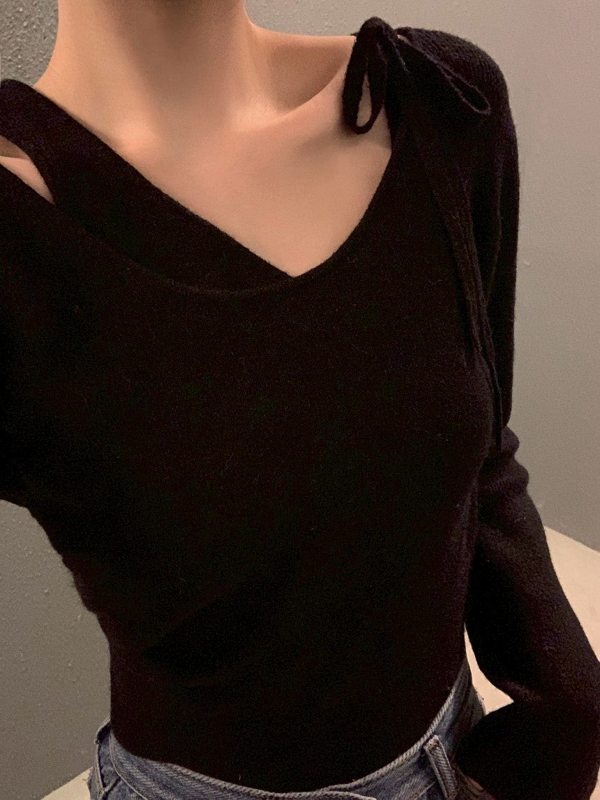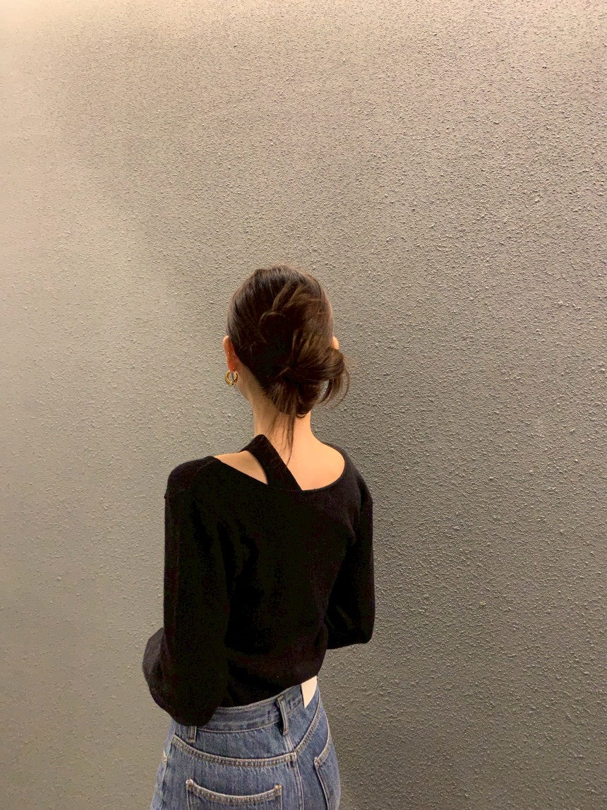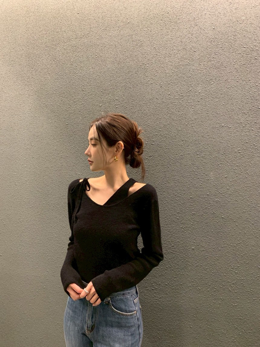 Mon. 不規則設計針織拼接長袖上衣 杏/黑