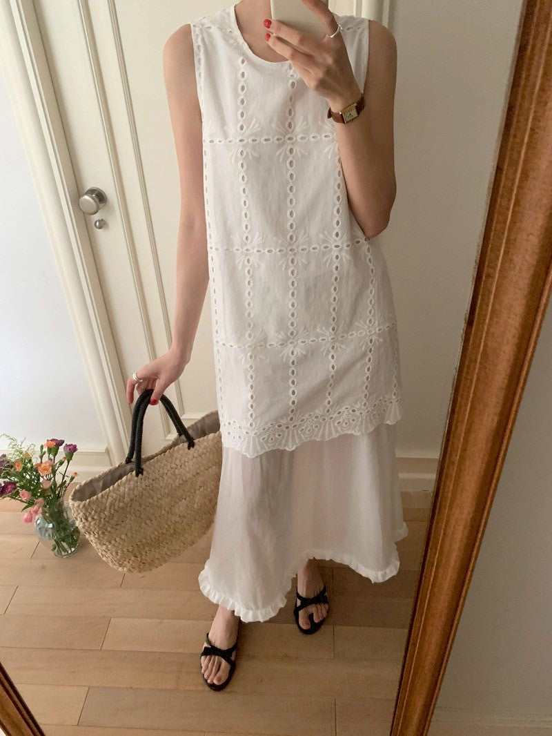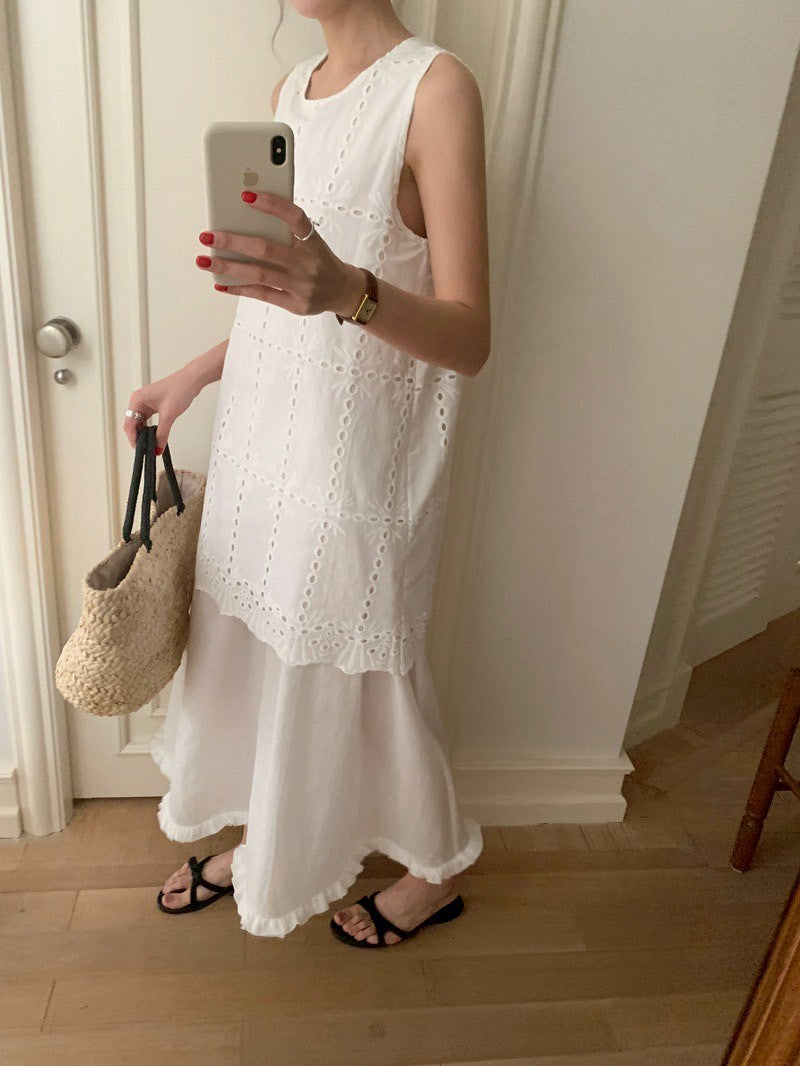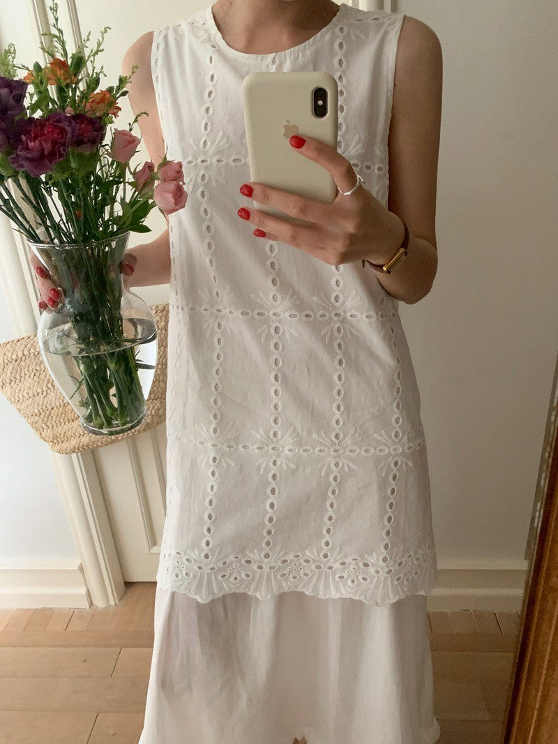 Mon. 主流小白花手工縷空刺繡背心小白裙