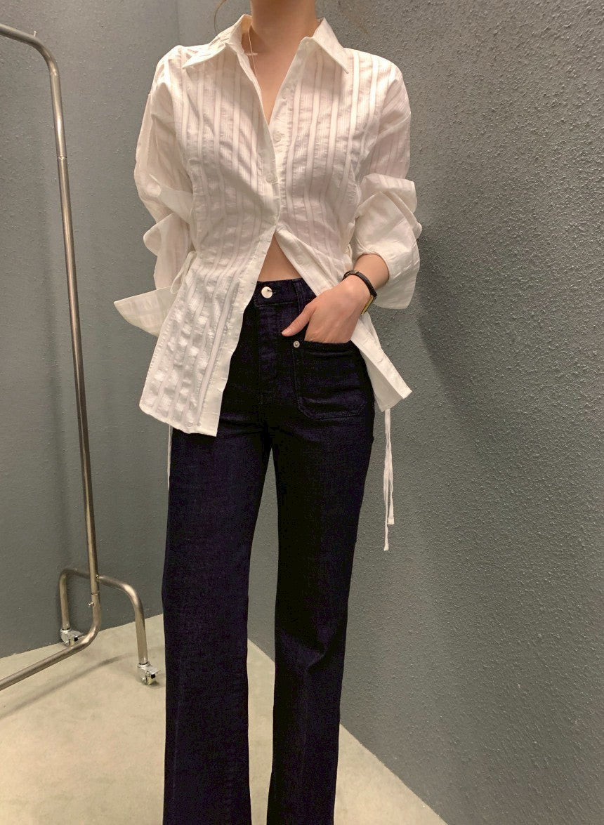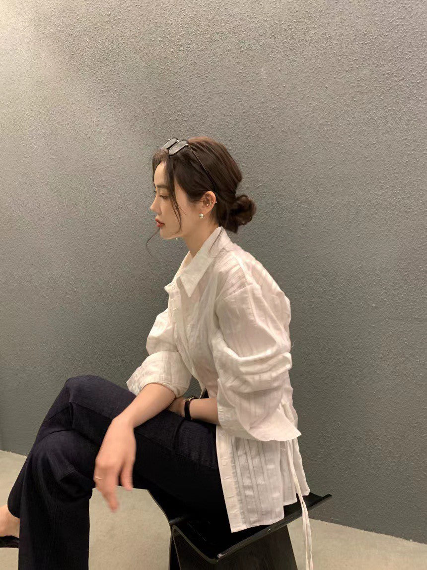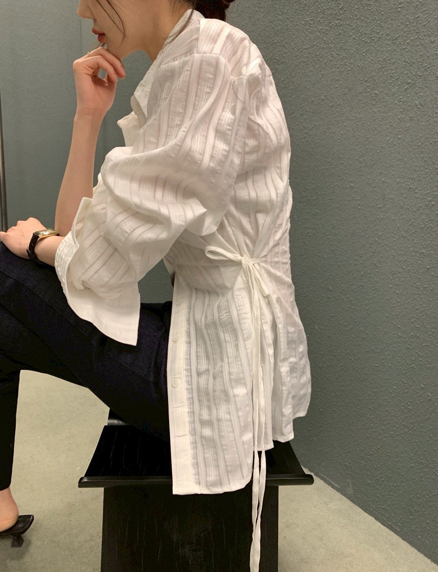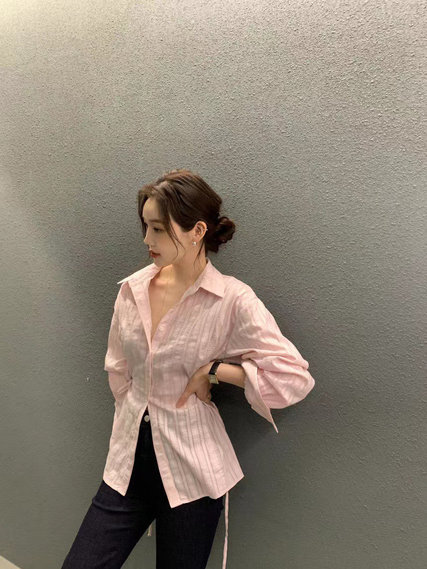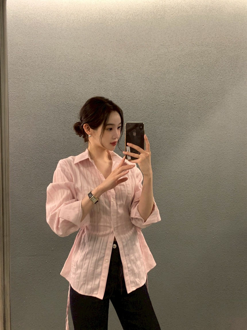 Mon. 個性翻領收腰抽繩可調襯衫 粉/白