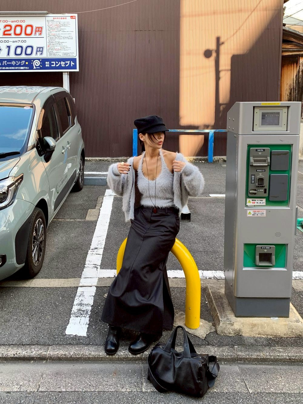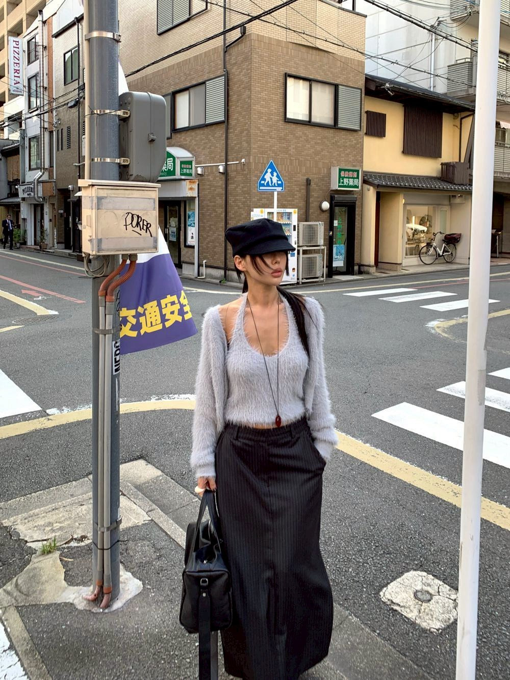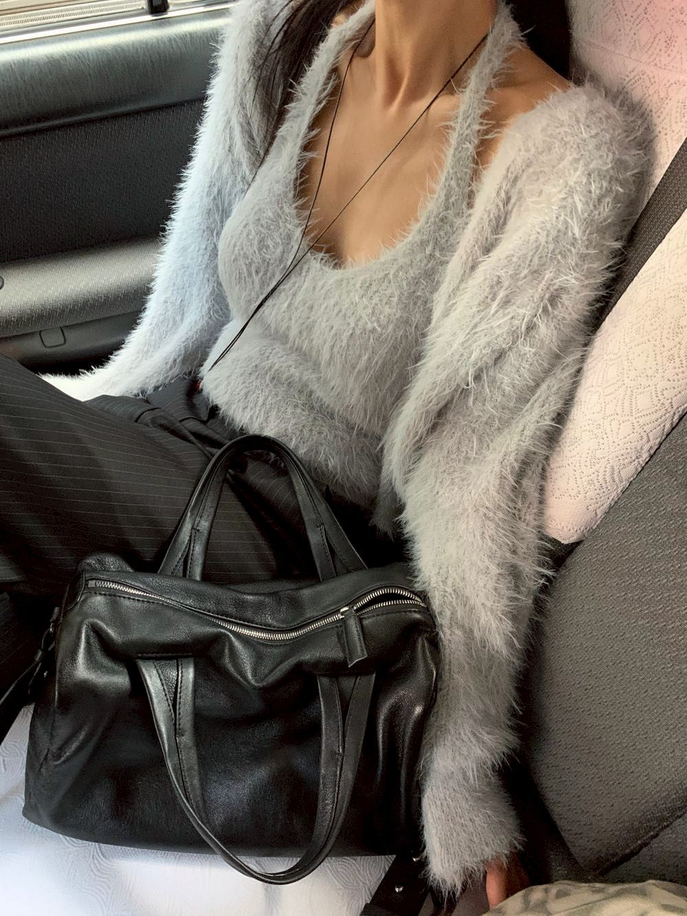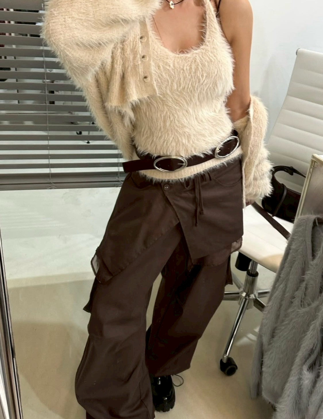 Mon. 歐美水貂毛鬆弛感上衣2件套 米/灰