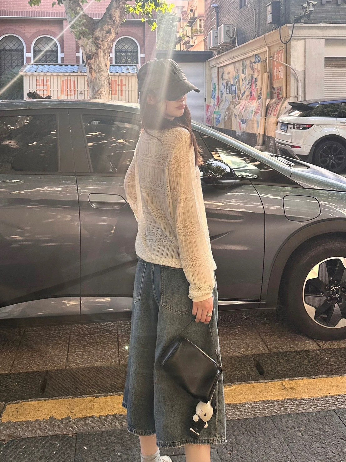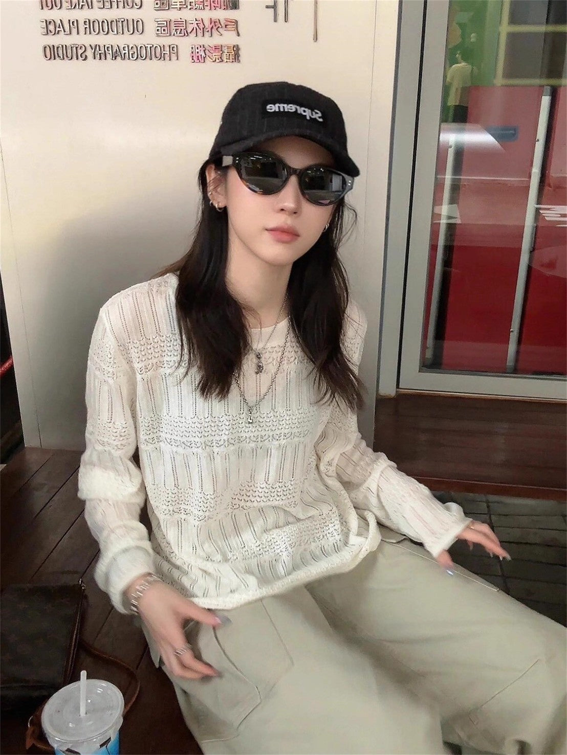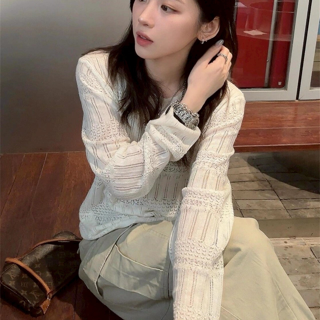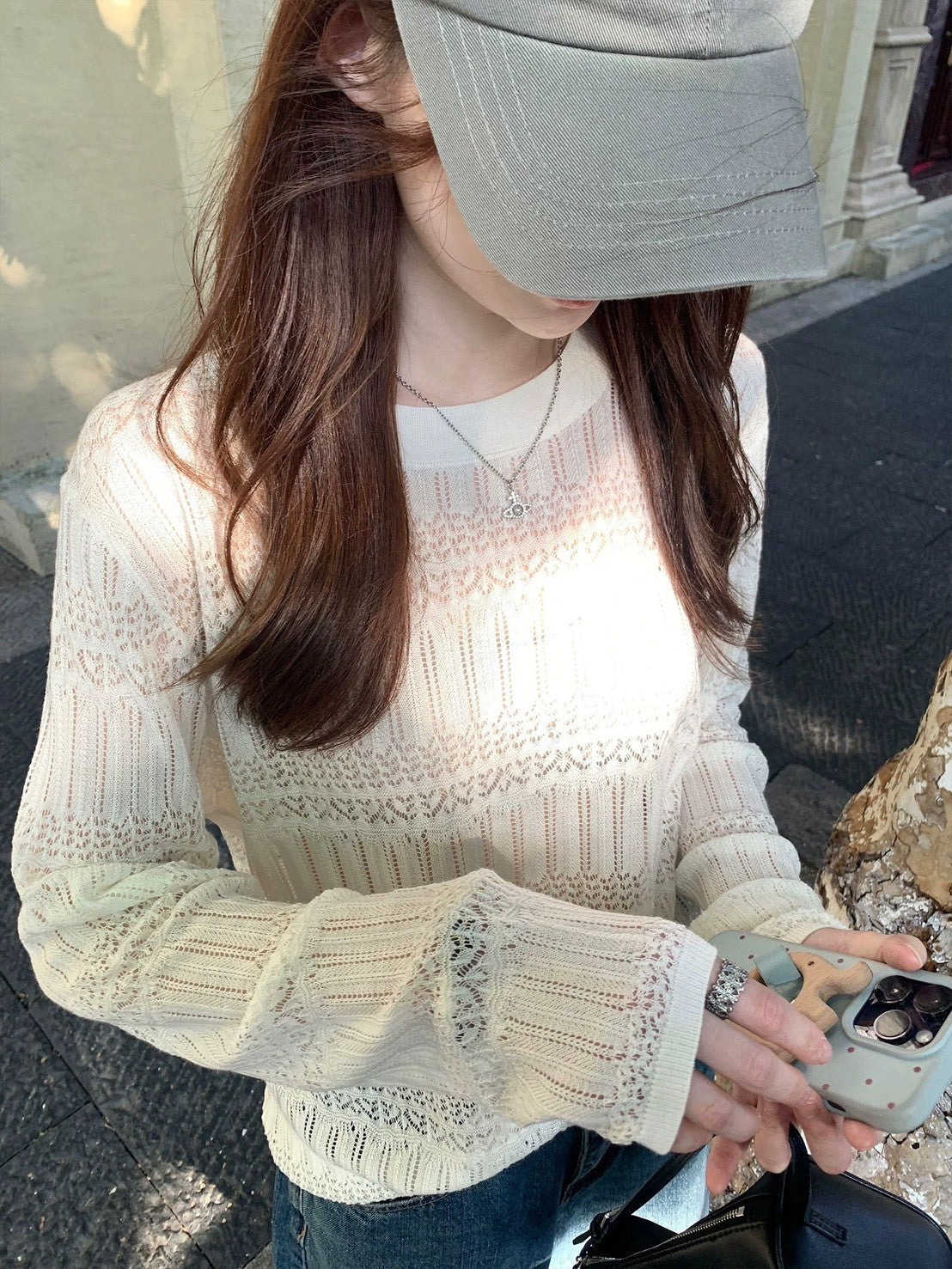 Mon. 淡系老錢 交叉縷空圓領針織薄長袖 白